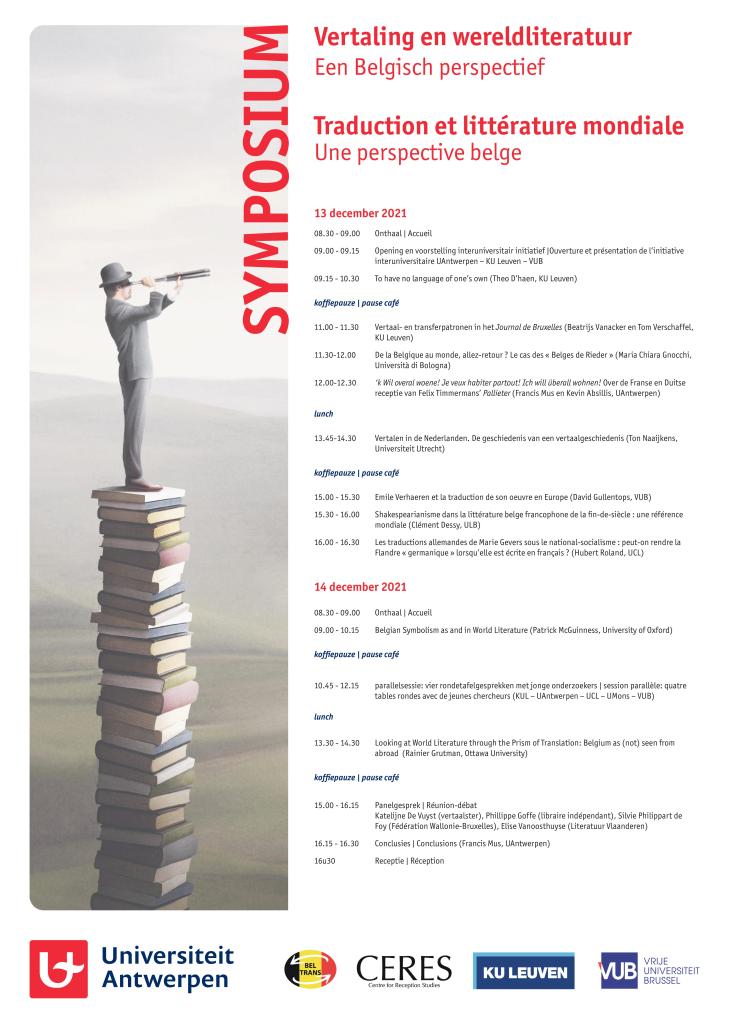 Le symposium Traduction et littérature mondiale. Une perspective belge est une initiative interuniversitaire [UAntwerpen – KU Leuven – VUB] qui a pu être réalisée grâce à des subsides du type OJO[Encadrement de Jeunes Chercheurs], de l’école doctorale d’Anvers. L’objectif est de réunir pendant deux jours des chercheurs qui travaillent sur des thèmes similaires dans des universités et/ou centres de recherche différents, afin de faciliter un échange d’idées et de projets, et de favoriser des collaborations à plus long terme.